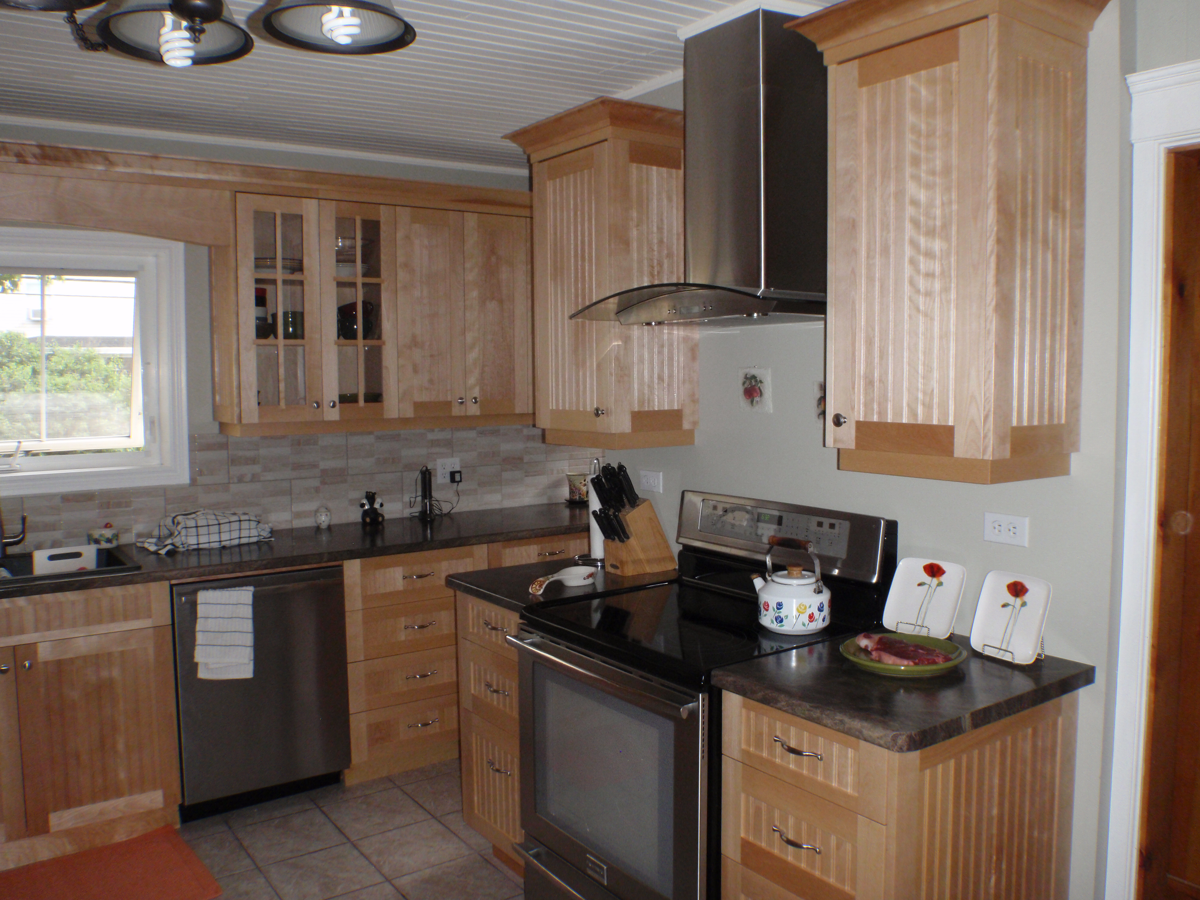 This birch bead board kitchen features solid birch doors and plastic laminate countertops complete with crown molding.